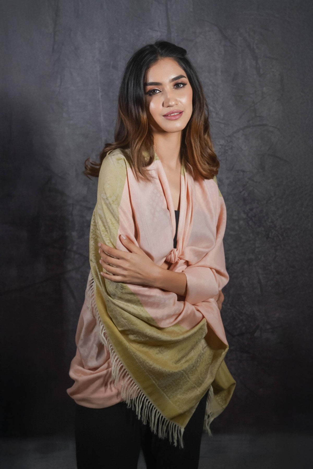 This Silk Wool Jacquard Shawl in Jamavar style features an elegant palla, showcasing intricate weaving that blends silk’s sheen with wool’s warmth. Designed for women, it offers a luxurious texture and refined sophistication, making it a timeless accessory that enhances any formal or traditional outfit.