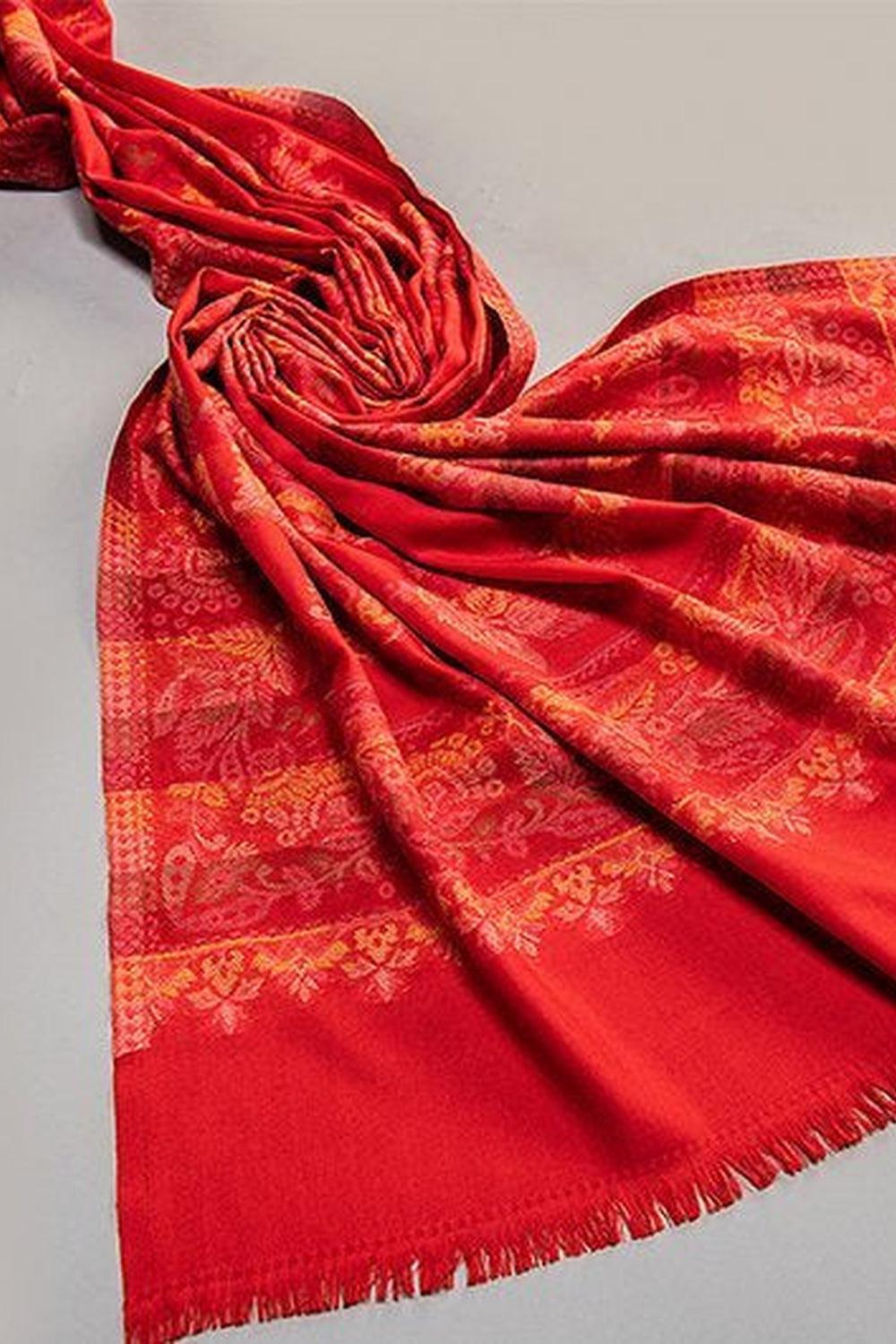 This Red Woven Jacquard Shawl in Jamavar style, crafted from premium merino wool, showcases exquisite jacquard patterns that blend vibrant color with traditional elegance. Offering both warmth and sophistication, it serves as a luxurious accessory to elevate any refined wardrobe.